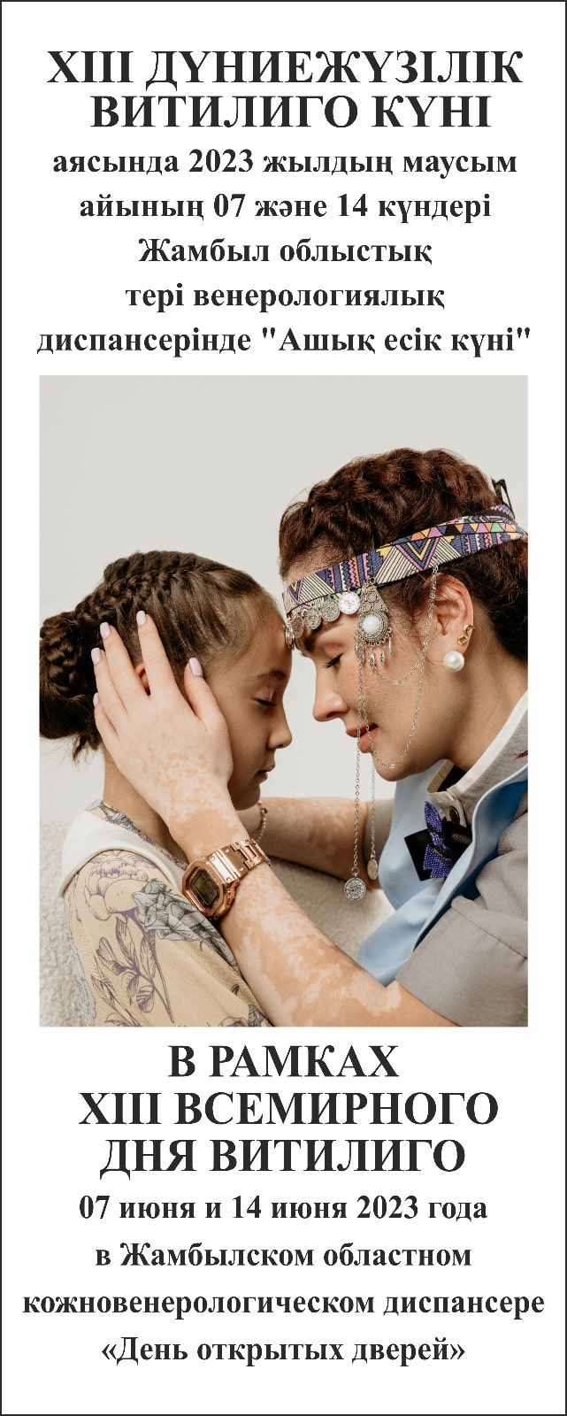 XIII Дүниежүзілік витилиго күні аясында Жамбыл облыстық тері-венерологиялық диспансері "Витилиго" диагнозымен пациенттерге 2023 жылдың маусым айының 07 және 14 күндері «Ашық есік күні ұйымдастырылып паценттерге тегін медициналық кеңес беріледі. Қабылдау диспансердің 3-қабатында 46 кабинетінде сағат 09.00-15.00-ге дейін дәрігер дерматовенеролог Айтқұлова Жанар Мұратқызы жүзеге асырылады. қабылдау мен консультацияға алдын ала жазылу: 52-13-63, 87088272873