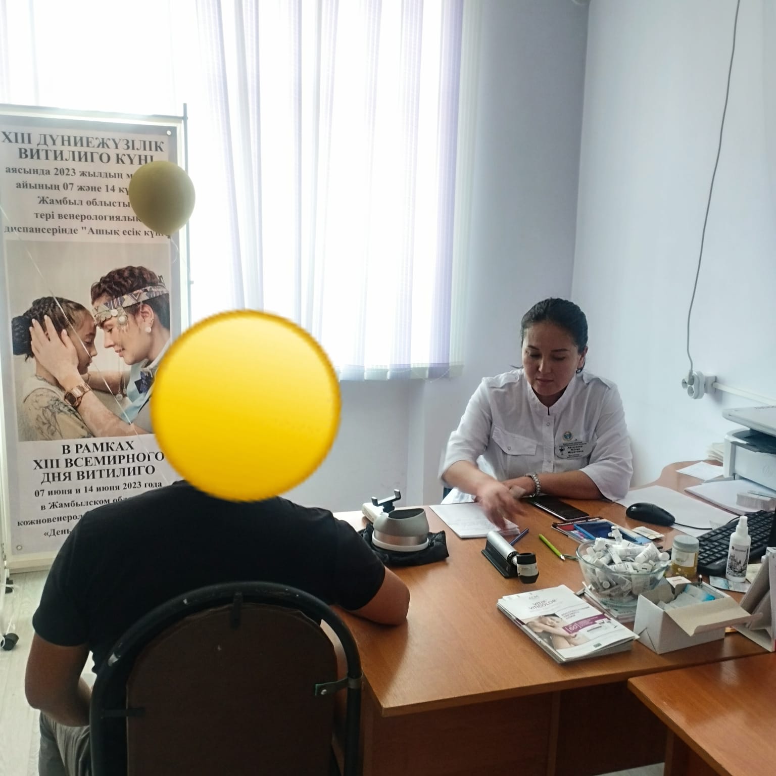 Сегодня 14.06.2023 г. был проведен 2 - й день открытых дверей для пациентов с диагнозом "Витилиго". Пациентам была оказана бесплатная медицинская консультация главного внештатного врача - дерматовенеролога Жамбылской области, заместителя главного врача по лечебной работе ЖОКВД Байбулатовой Салтанат Мараткалиевны и врача - дерматовенеролога Айткуловой Жанар Муратовны.